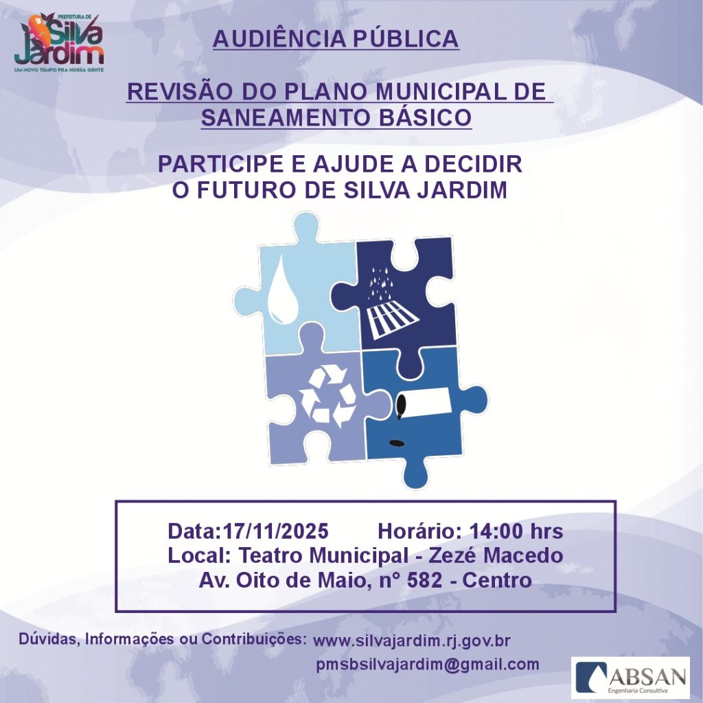 Visando a conclusão da revisão do Plano Municipal de Saneamento Básico (PMSB), referente às prestações dos serviços públicos de abastecimento de água potável, esgotamento sanitário, drenagem e manejo das águas pluviais urbanas, e limpeza urbana e manejo de resíduos sólidos, com ampla participação popular, a Prefeitura Municipal de Silva Jardim (RJ) convida toda a sociedade civil e entidades para participarem da Audiência Pública para aprovação das informações/propostas do PMSB.